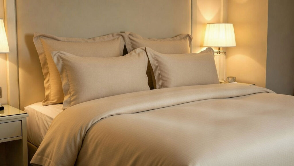 Posteljina u šampanj nijansi sa bisernim sjajem za vrhunski osećaj ekskluzivnosti.