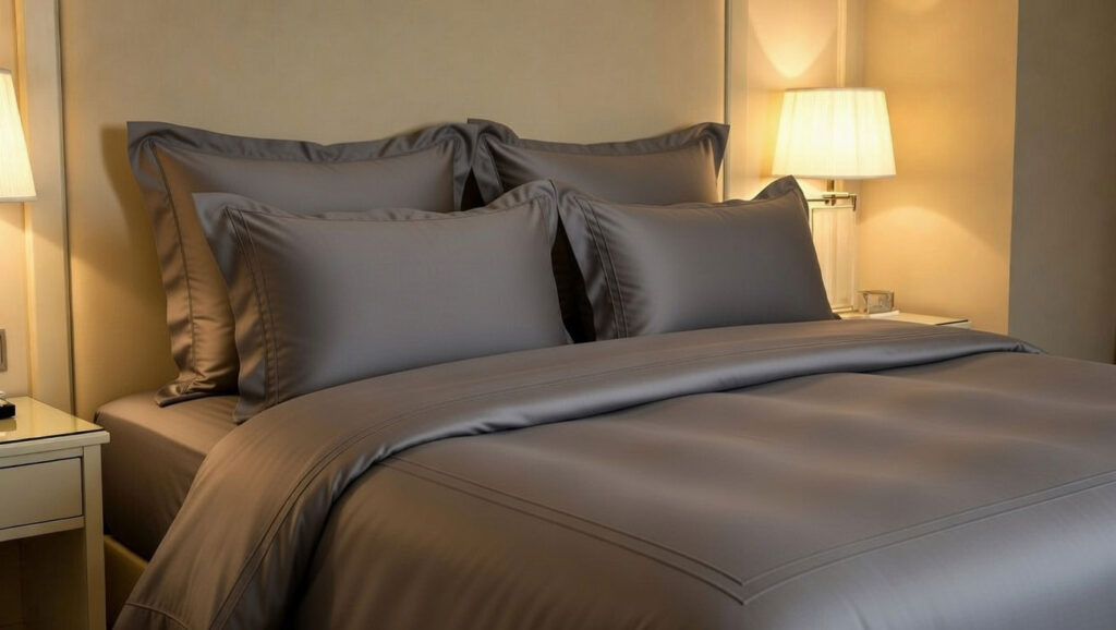 Tamno grafitna posteljina sa diskretnim linijskim detaljima za moderan luksuz.
